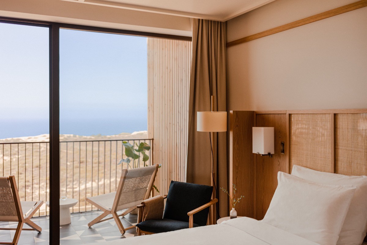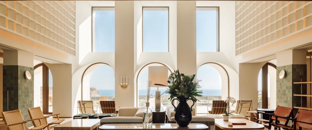 The building's past reads like a Portuguese soap opera. It was a farm, became a rehabilitation centre, then sat abandoned for ten years. In 2018 Aethos arrived, and reimagined it with architect Luís Pedra Silva. They kept the farmhouse's arched alcoves and clay roof, and introduced protruding box windows and soaring volumes. Inside, Astet’s interiors avoided Portuguese tile clichés in favour of tones drawn from sand, cliffs and sea. The layout connects a central lounge and library to a heated saltwater pool, a cliff-edge wooden walkway, a yoga deck above the Atlantic, and landscaped paths down to the beach.