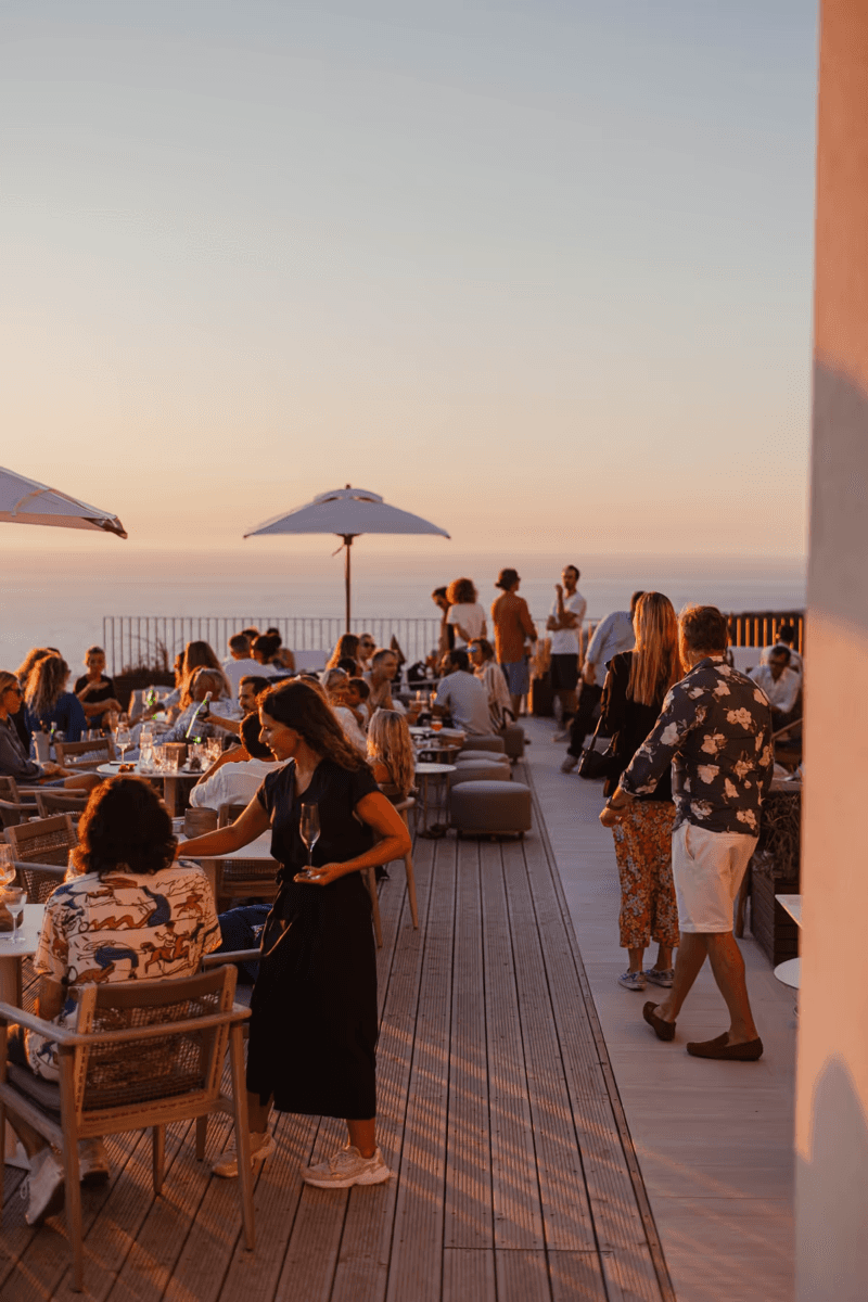 The ONDA bar serves cocktails and lighter bites from mid-afternoon, shifting the mood from coffee-and-laptop to something more social as the light drops. By late afternoon, the firepit area takes over.