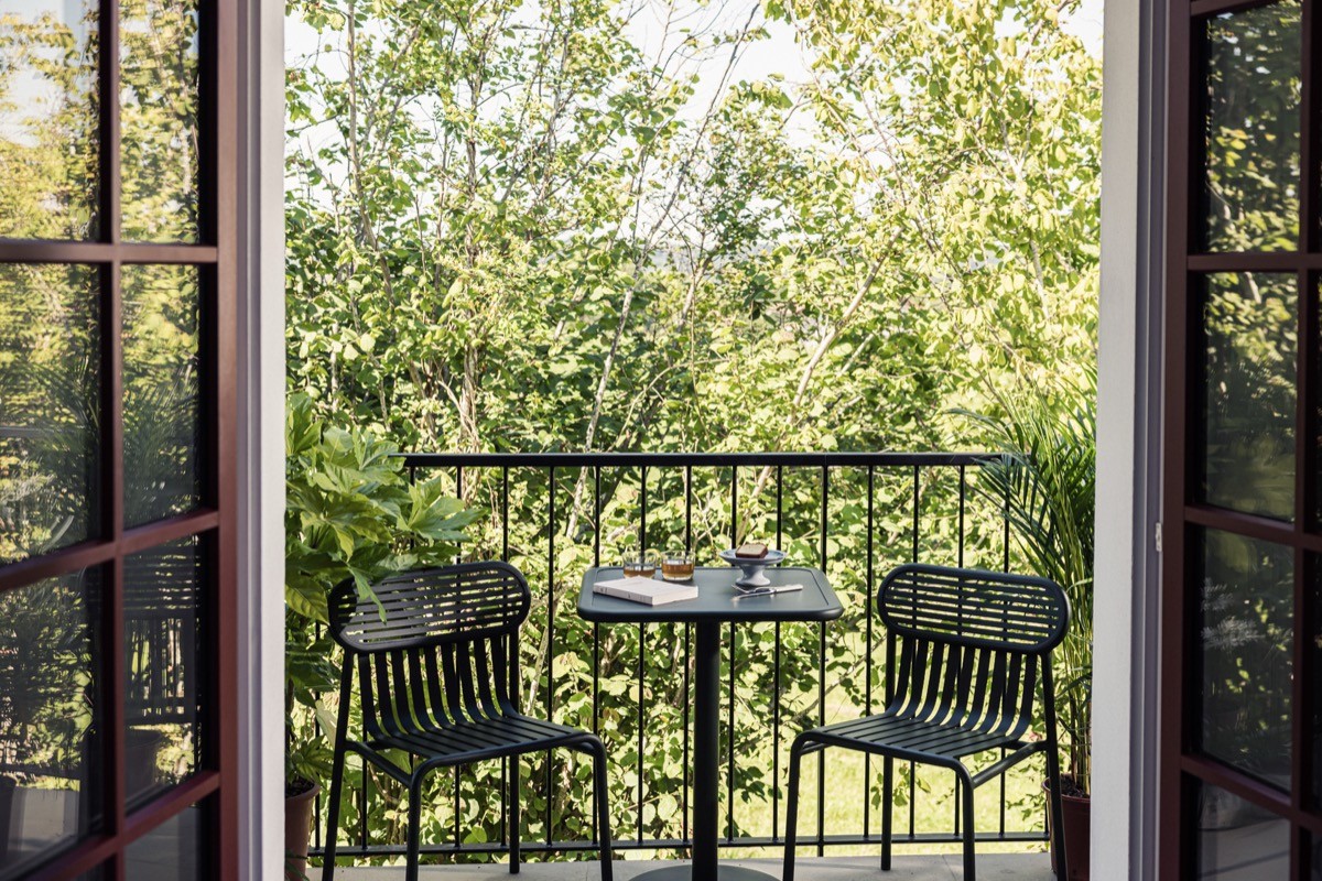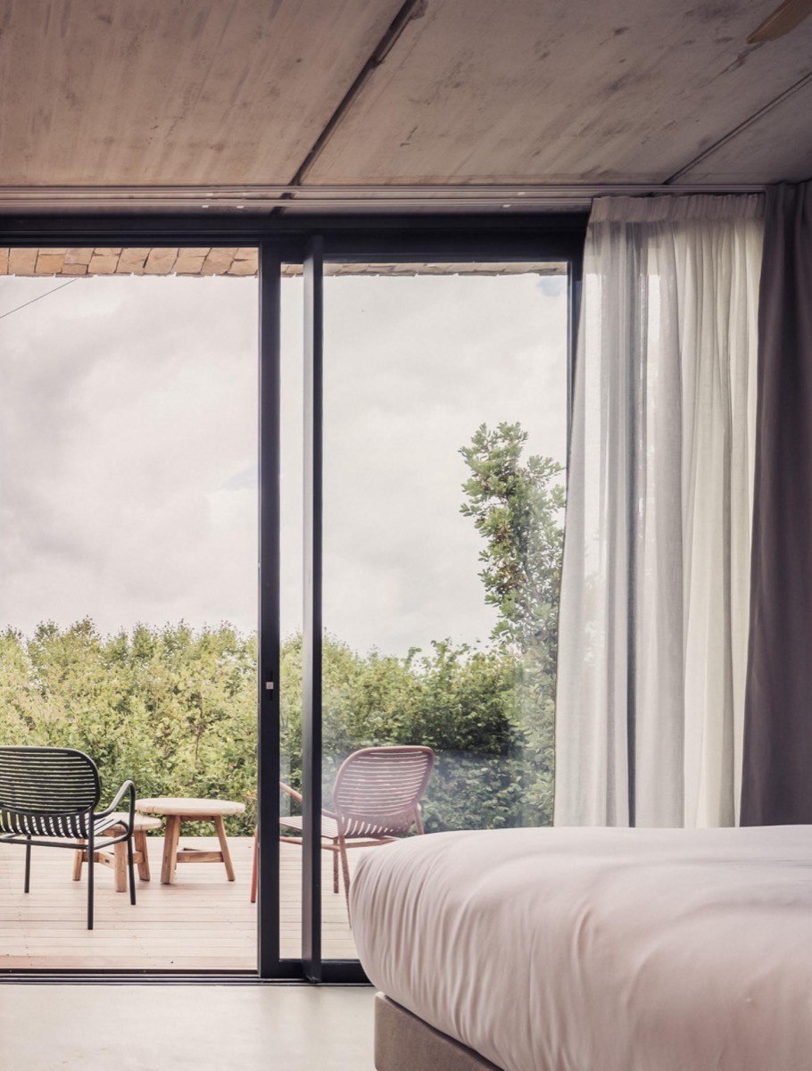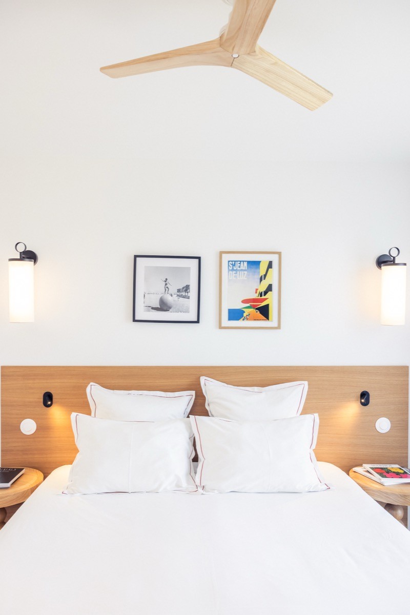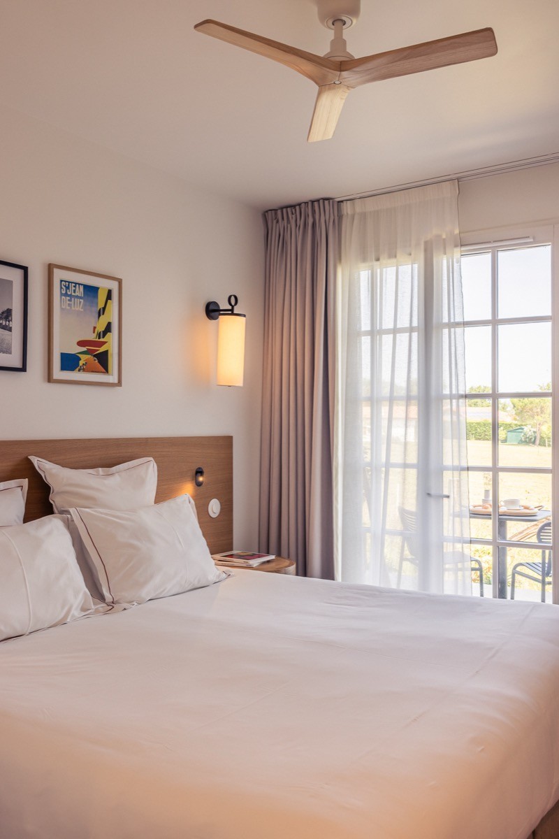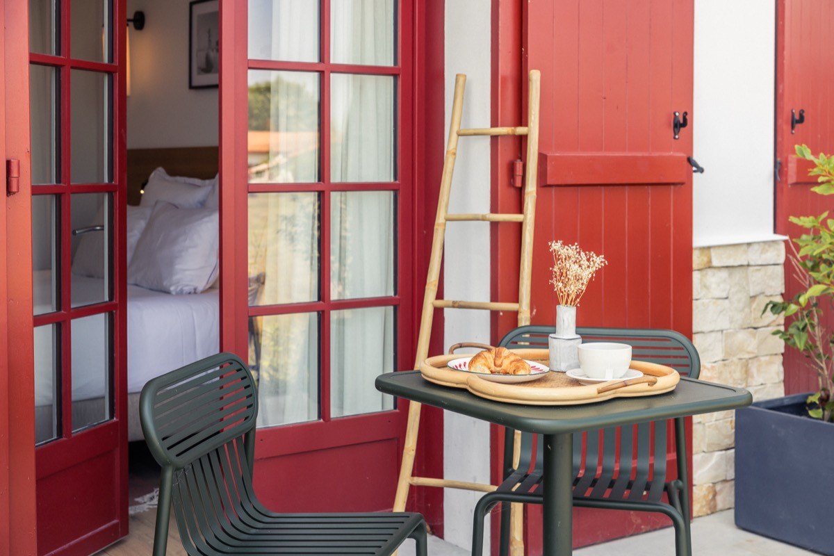Carrère's design language runs throughout: clean lines, warm light, cosy atmosphere. Contemporary art and photography bring life to the walls. Bathrooms have walk-in showers and Alaena skincare products. Every room has air conditioning, sound insulation, and Wi-Fi that actually works. Some have private terraces or balconies looking onto the garden or the Basque countryside beyond.