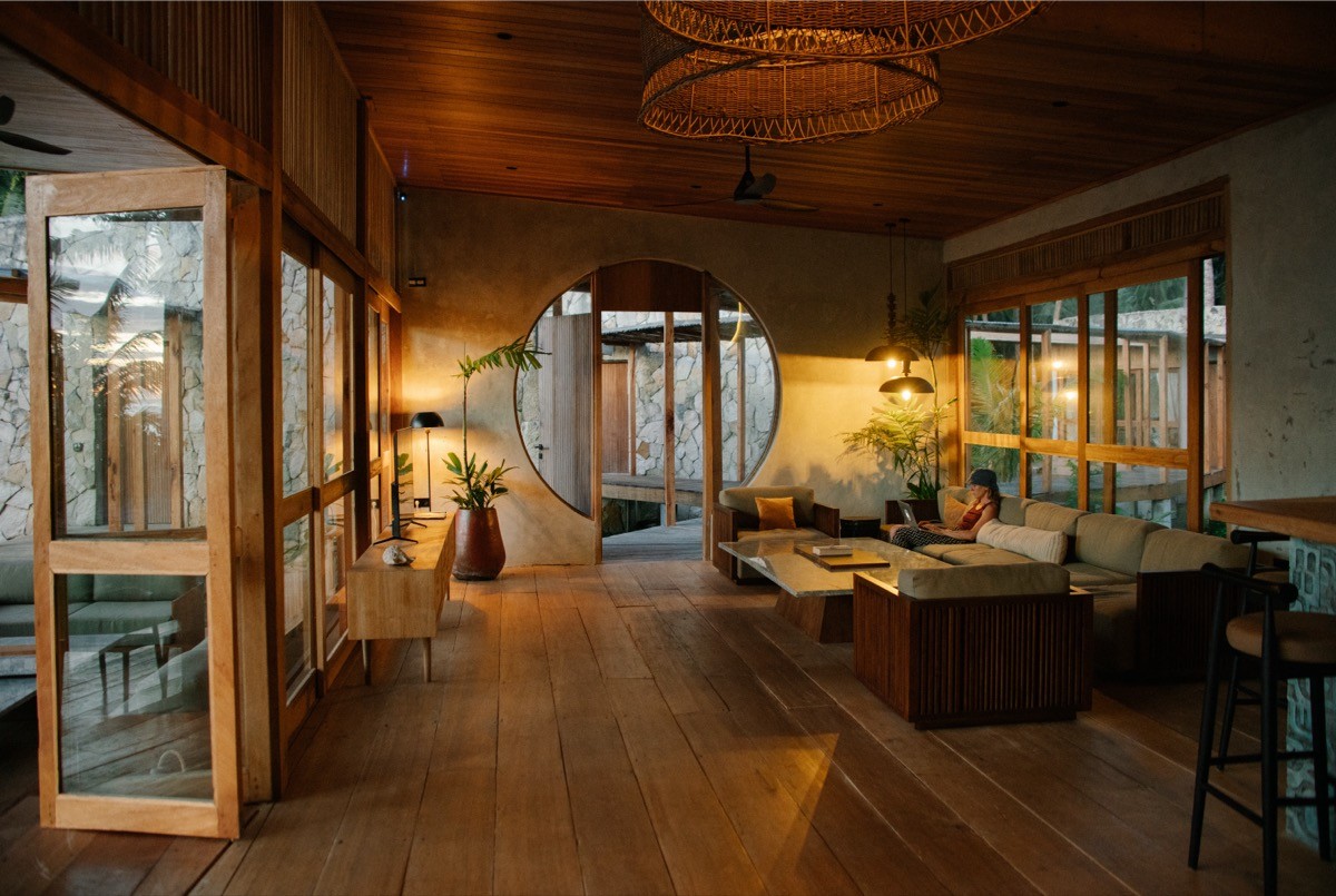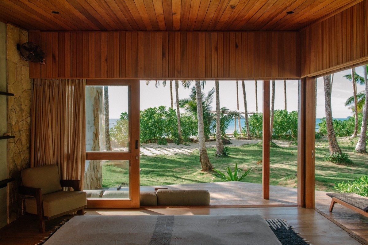 The natural blends with the architectural, the wild with the refined. It’s the work of Biombo Architects who designed every detail. Everything built here had to arrive by boat, which shows in the choices: durable materials, passive cooling, and furniture that will not surrender to salt air. The operation runs entirely on solar power. Water comes from rain collection and wells, filtered on site.