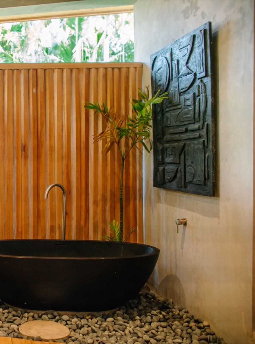 The palette is native: Mentawai wood, natural stone, handcrafted furniture. Woven rattan pendant lights throw geometric shadows across the floor at night. The beds are platform-style, built from salvaged hardwood and dressed in high thread-count cotton. Bathrooms are semi-open (and completely private), featuring a stone rainfall shower inside and a large outdoor bathtub where you can bathe with the sounds of jungle.
