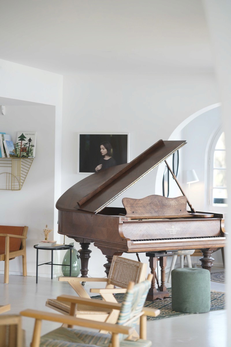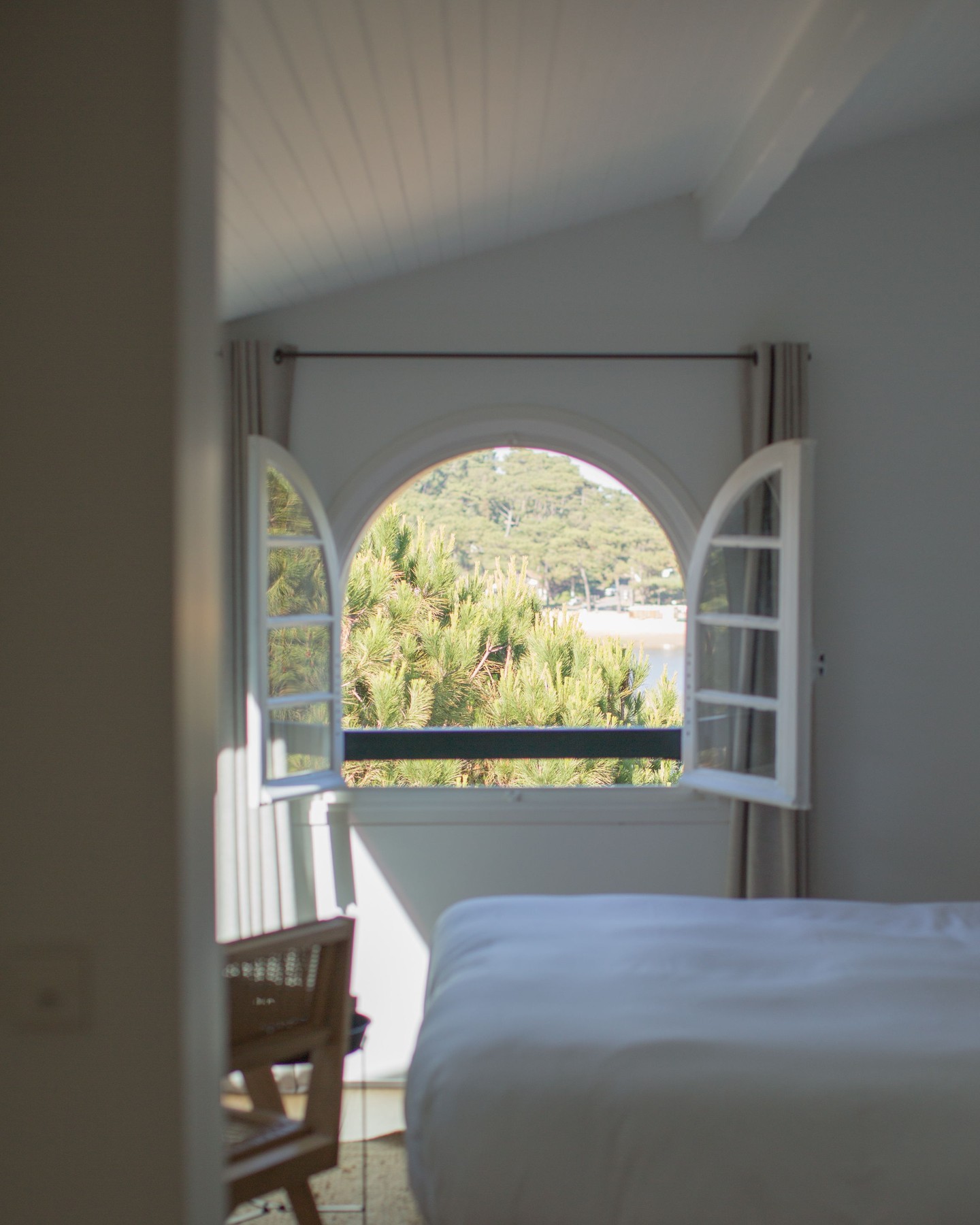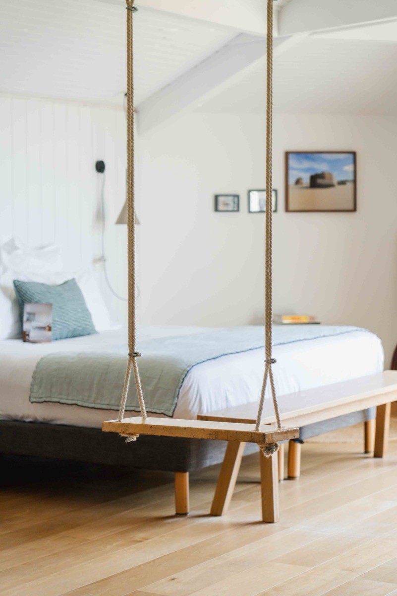 The architecture gives the spaces their character, allowing the interiors to remain deliberately understated. White-panelled walls, pale wood, linen and natural fibres keep the palette soft and restrained, with touches of terracotta, muted green and soft grey used sparingly throughout. Fifties-inspired furniture mixes with vintage objects and local craftsmanship.