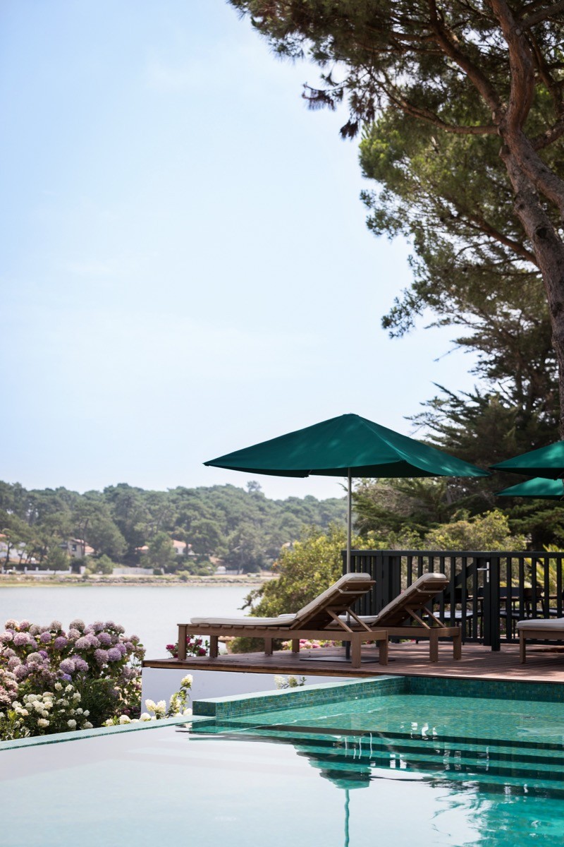 The building is a 1930s Art Deco Landaise villa with white walls, arched windows, and dark timber beams. The Fontenille Collection acquired it in 2019 and renovated it with designer Beryl Le Lasseur. A grand piano, inherited from the original décor, still anchors the veranda lounge. Outside, an emerald-tiled infinity pool seems to spill towards the lake.
